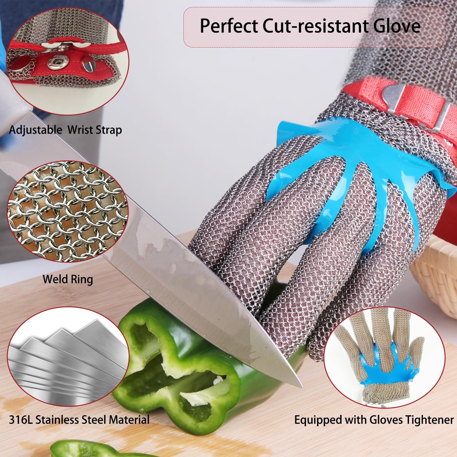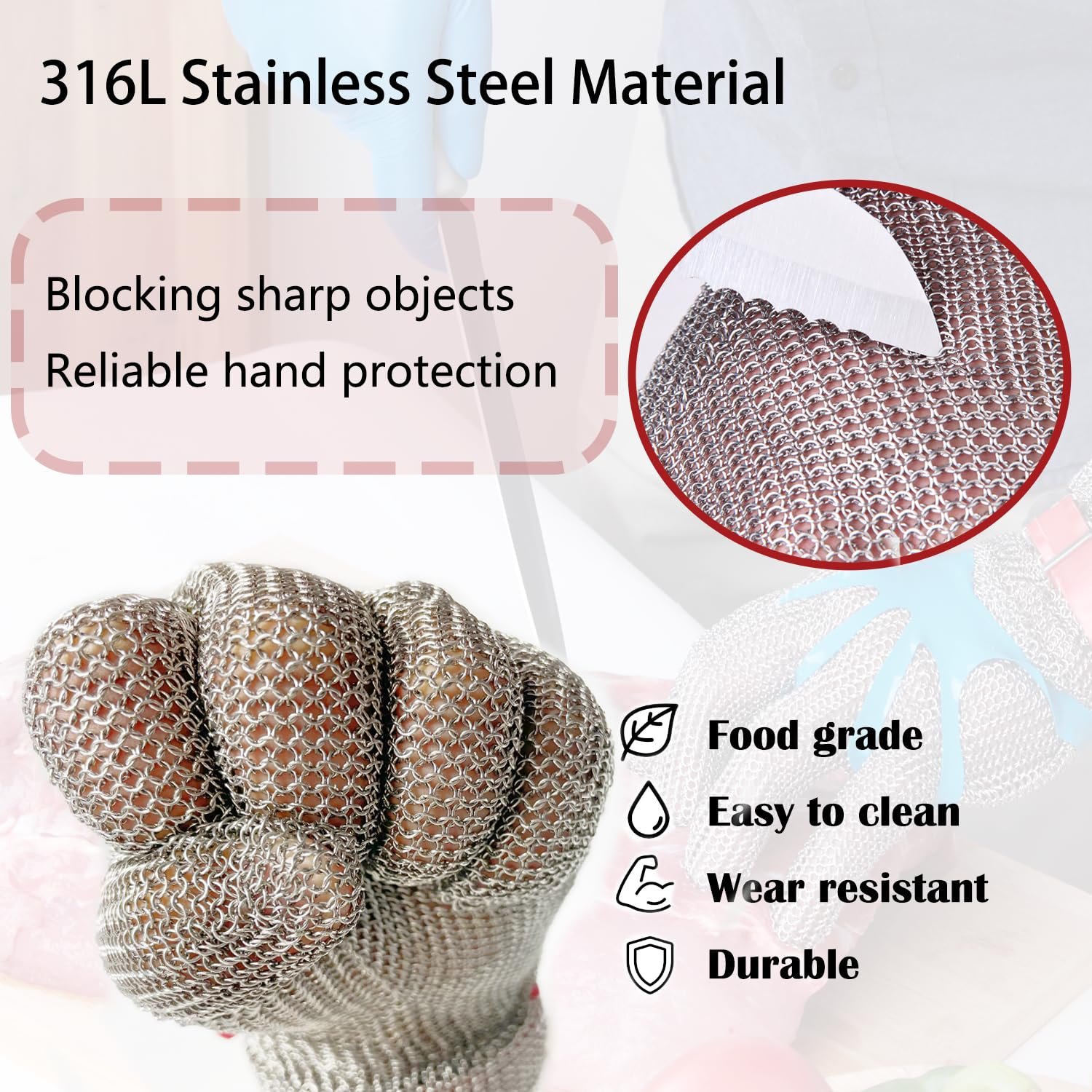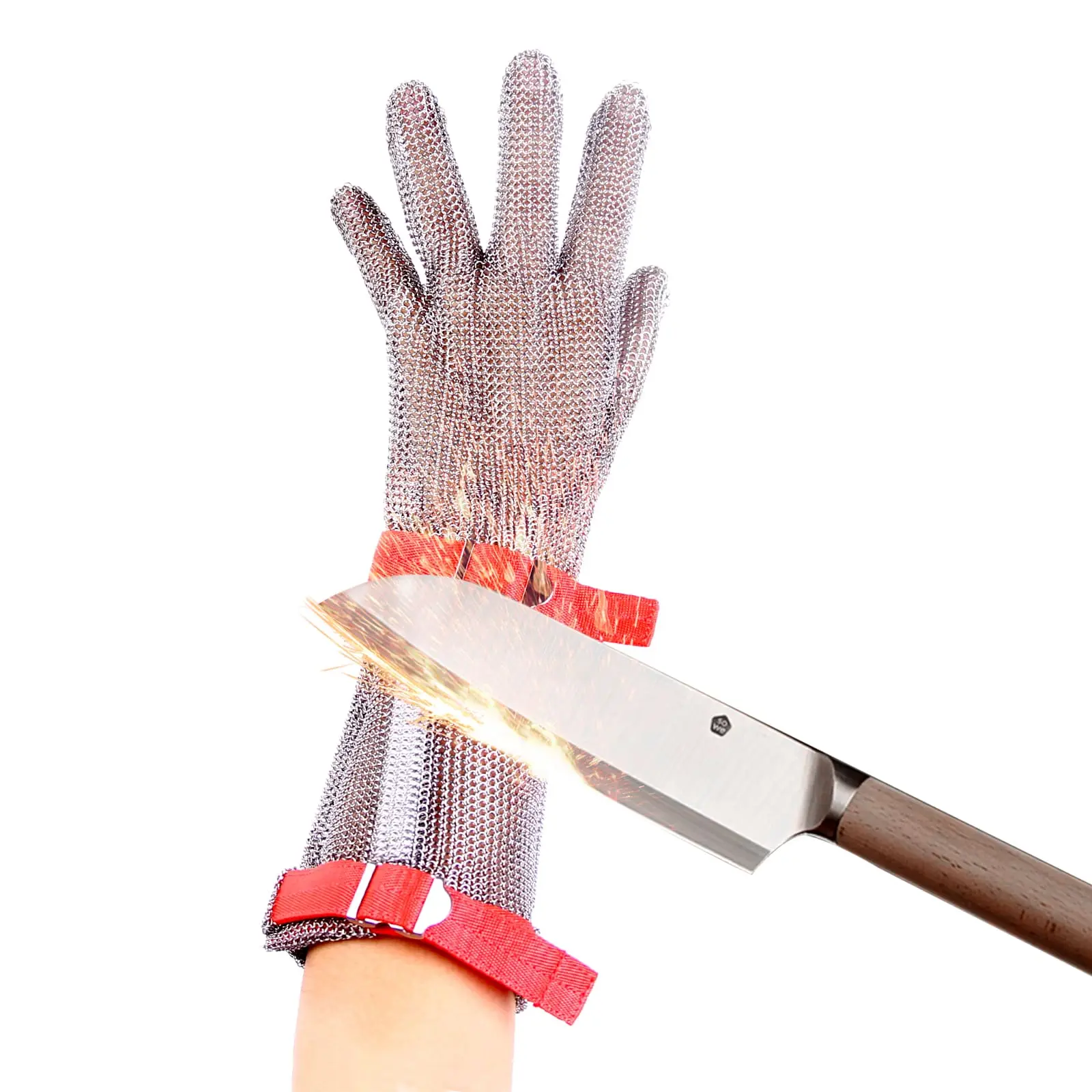 – The interlocking metal mesh structure absorbs and disperses force from knives and sharp tools, providing reliable protection without limiting hand movement.