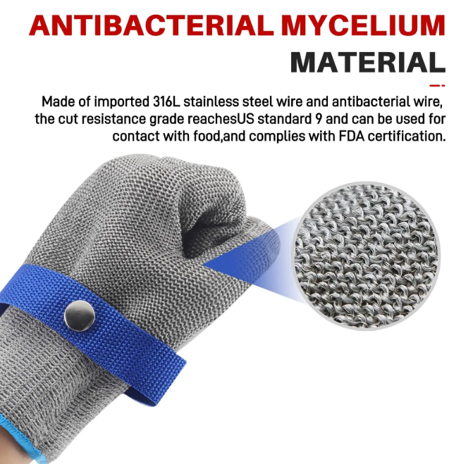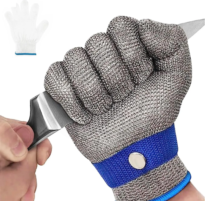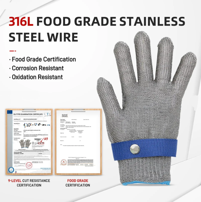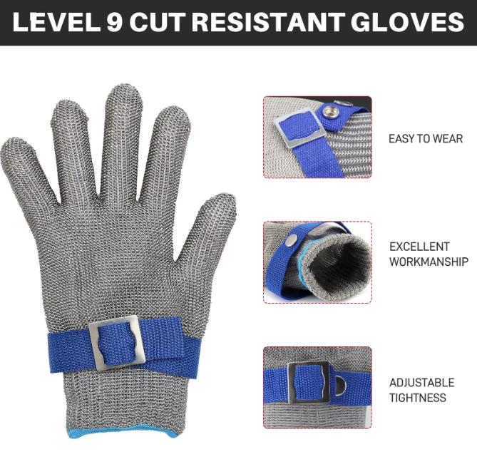 – Made of premium stainless steel mesh combined with HPPE high-performance fiber, delivering strong ANSI A9 cut resistance.