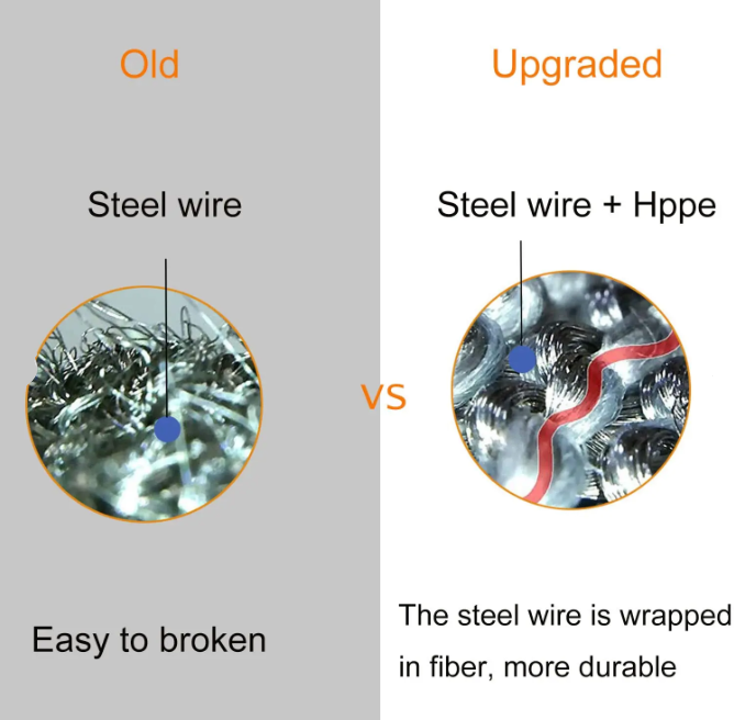 – Stainless steel wire is wrapped with HPPE cut-resistant polyethylene and elastic fiber for enhanced strength.